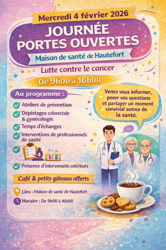 Les professionnels de la Maison de Santé de Hautefort ont le plaisir de vous inviter à leur journée portes ouvertes, qui se tiendra le mercredi 04 février 2026, de 9h00 à 16h00, au sein de la Maison de Santé de Hautefort.